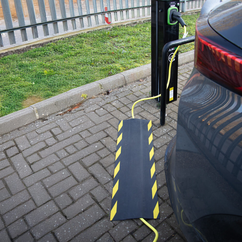 - Wytrzymała gumowa mata do ochrony kabli, przeznaczona do zastosowań przemysłowych i komercyjnych