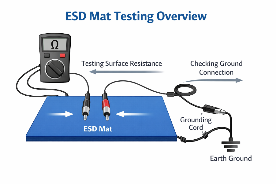 Testing ESD mats typically requires specialised resistance and continuity measurement equipment designed for static control applications.